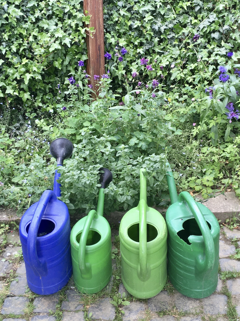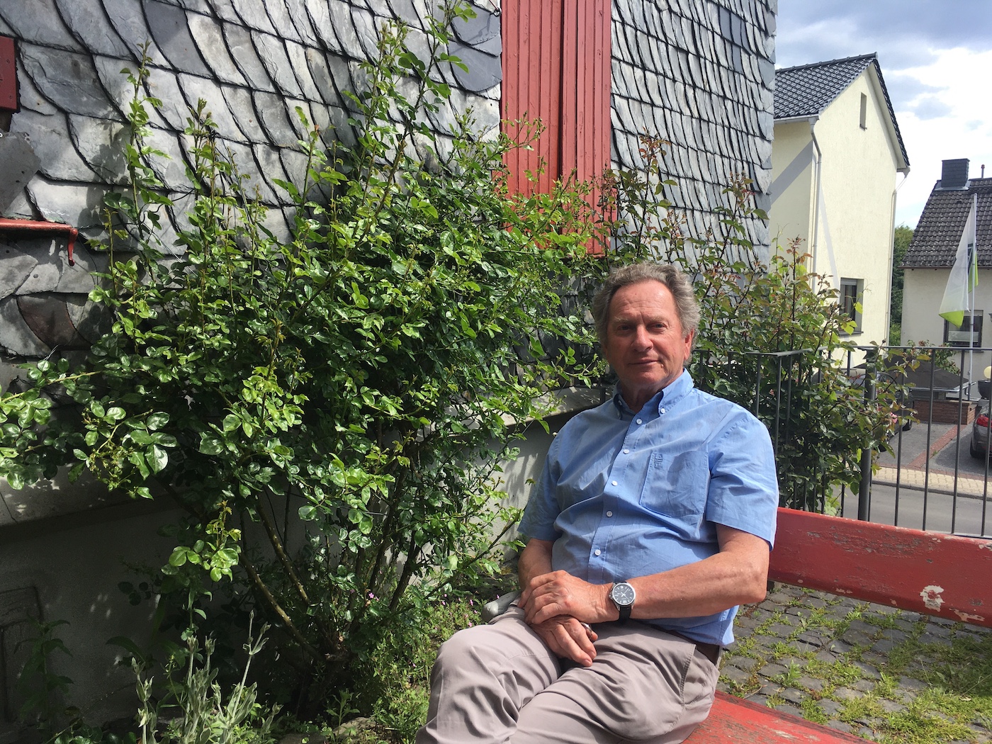 Dem Plätzchen und Herrn Lehmann gehört schnell mein Herz. Es ist lauschig hier, auf den knarzigen Holzbänken, es plätschert Wasser in einer Tränke, um uns herum Blumen, ein Arrangement aus Gießkannen, stetiger Trink-Nachschub aus dem Kühlschrank. Und natürlich der nette Zahnarzt a.D., der uns seine Geschichte erzählt, und dem anzuhören ist, wie gern er hier, in diesem Ort, lebt, sich für ihn einsetzt, ihm verbunden ist, obwohl er einst Frankfurt ebenso kennengelernt hat wie Mainz (die anderen, eher zu vernachlässigenden Metropolen).