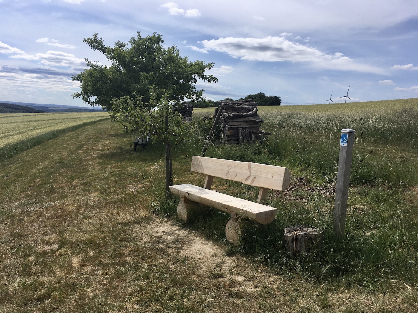 Ein kleiner putziger Hain erwartet uns gleich zu Beginn des Wegs, danach: Felder über Felder. Saat-Gerste, wie mir meine Pflanzen-Erkennungsapp verrät, später auch Raps, dazwischen Kornblumen, Klatschmohn, Applaus, Applaus. Das ist wirklich eine feine, offene, panoramareiche Landschaft, ich genieße jeden Schritt. „Die hätten die Route auch um einiges abkürzen können“, sagt der Mann, als er erkennt, dass wir hier und dort etwas im Kreis (gleichbedeutend für ihn mit: an der Nase) herumgeführt werden. Also per Hinweisschilder länger in der Felder-Gegend herumgeleitet werden als nötig. Hier noch ein Kringel, dort noch ein Schlenker. Ja klar, die 10,9 Kilometer müssen ja irgendwie zusammenkommen, hier, zwischen den Dörfchen Langenseifen (unser Start) und Ramschied (Ziel, bevor es auf alternativem Weg wieder zurückgeht).